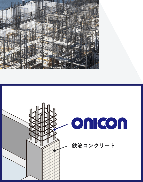 当社では、1962年に鉄筋コンクリートの支柱となる高張力異形棒鋼「ONICON(オニコン)」を