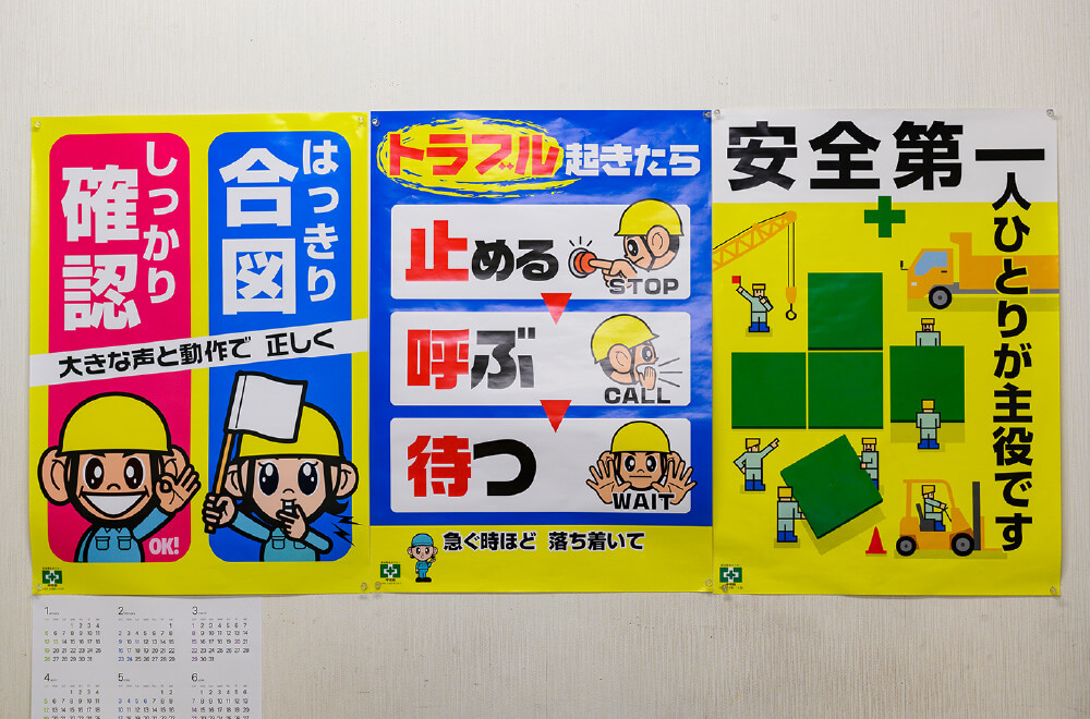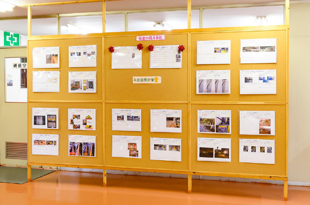 工場内では注意喚起表示や掲示板などで視覚に訴える「見える化」を推進、職場の「全員」が、現在安全について何に取り組んでいるかを確実に理解できるようにしています。